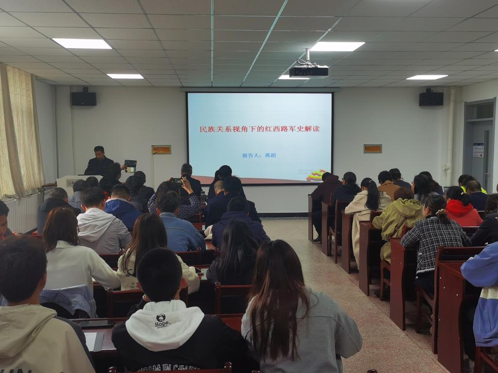 报告会上,蒋超教授从西路军成立的过程以及后期所面对的残酷环境、杨文局的天祝情结、肃南民族同胞对西路军的援助三个方面,借助大量详实的电文、照片等历史档案资料,生动讲述了红西路军在河西走廊的英勇斗争史,解读了西路军的历史贡献和崇高革命精神,使在场党员师生无不动容。同时为全体党员、广大师生准确把握红西路军历史发展的主题主线、主流本质,学习党史提供了很好地指导作用。